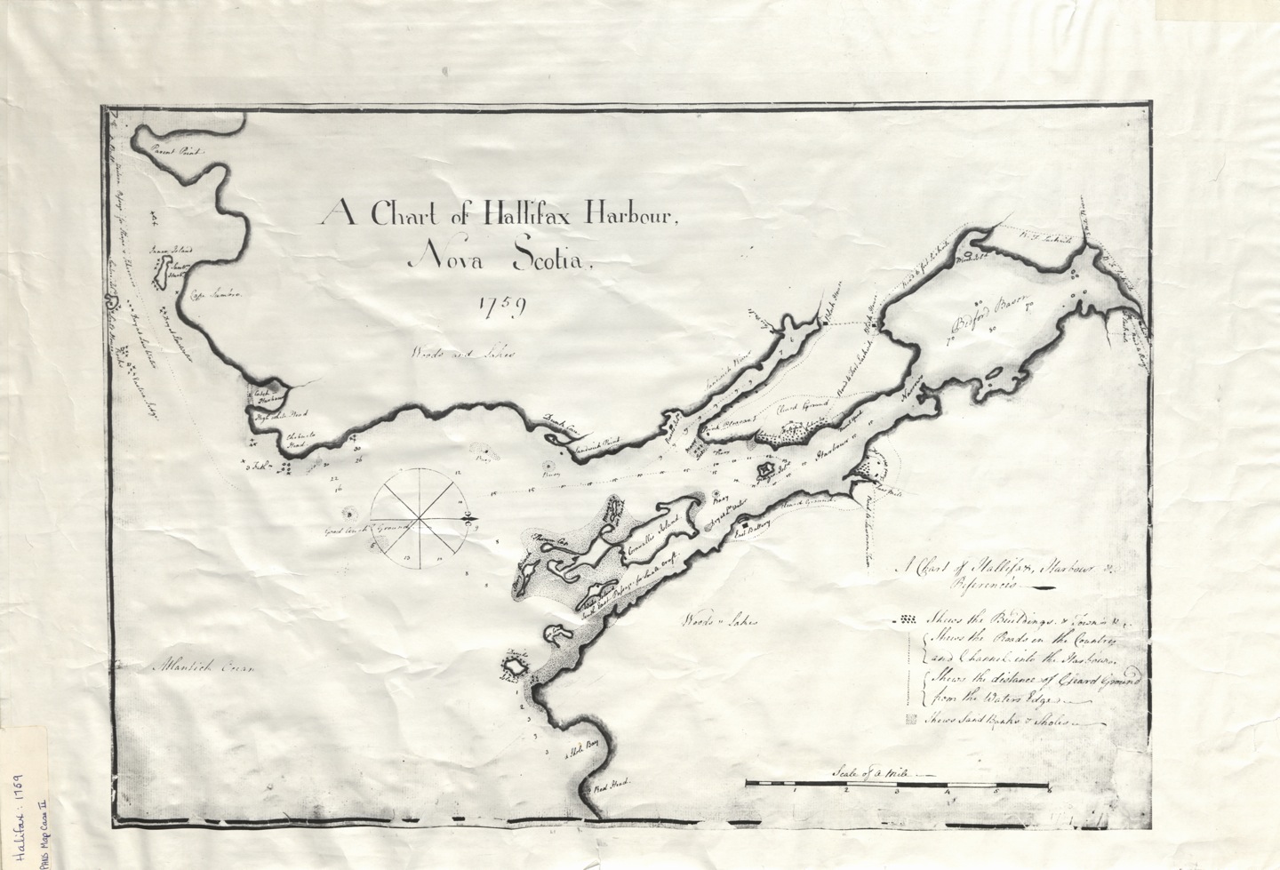 I have come across this map from the year 1759. Created only 10 years after the drawing in my previous post, according to this image nearly half of the peninsula had already been cleared. This early nautical chart also gives some indication of the terrain around the peninsula, and thus quite possibly the land that was being leveled: woods and lakes.