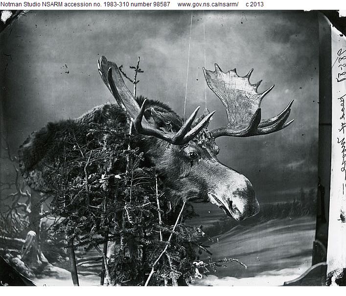 Courtesy of Nova Scotia Archives, Halifax, NS. This image was taken in the Notman photo studio, in Halifax. There is no date for this image, but the studio operated in the city between 1869 to 1920. Although I am not sure who mounted this moose head, it is a reminder that Haligonians were conscious of the wilderness in their province- hundreds of such examples of taxidermy would have adorned the homes of city dwellers. In a way, even when the wildlife left the city limits, citizens found a way to bring it back and to continue living alongside it.